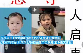 3岁女童院内玩耍失踪近三个月,刑警已介入 3岁半女童琪琪3月8日在渭南老家门口玩耍失踪后,截至6月2日仍没有踪…